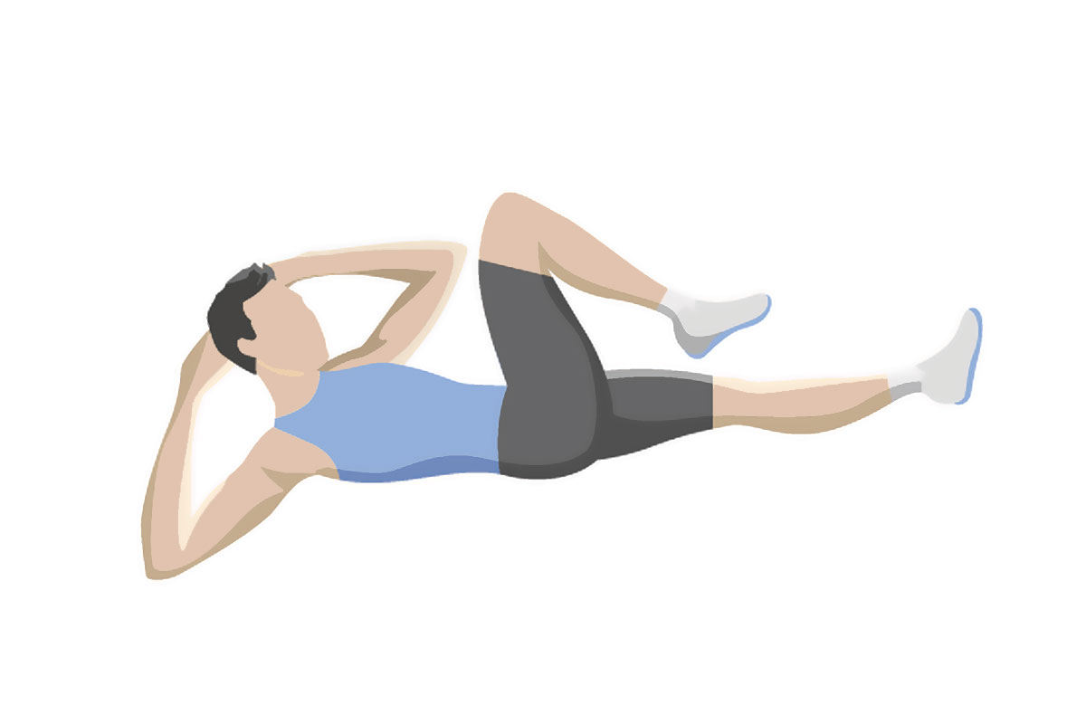 Исходное положение — лежа на спине, одна согнутая в колене нога на полу, другая заложена вверх. Руки за головой — однако без чрезмерного давления. На выдохе медленно тянитесь локтем к противоположному колену, сокращая пресс. Выполните 2-3 подхода по 12-15 повторений на каждую сторону.