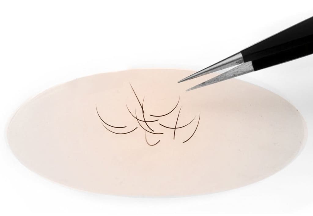 - Само наращивание: мастер выделяет с помощью пинцета натуральную ресницу, другим пинцетом берет искусственную, опускает в клей и ставит сразу на натуральную.
