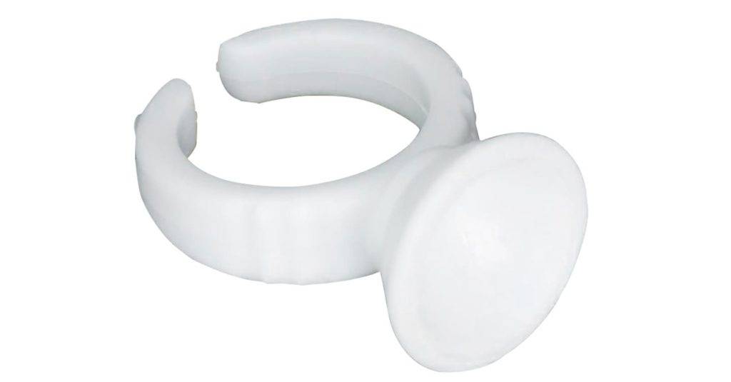 Кольцо. Выполнено из пластика, в середине имеется небольшое углубление, в которое наливают клеящий состав. Кольцо надевают на палец, что позволяет сократить время процедуры: женщине не обязательно тянуться к емкости с клеем, стоящей на столе.