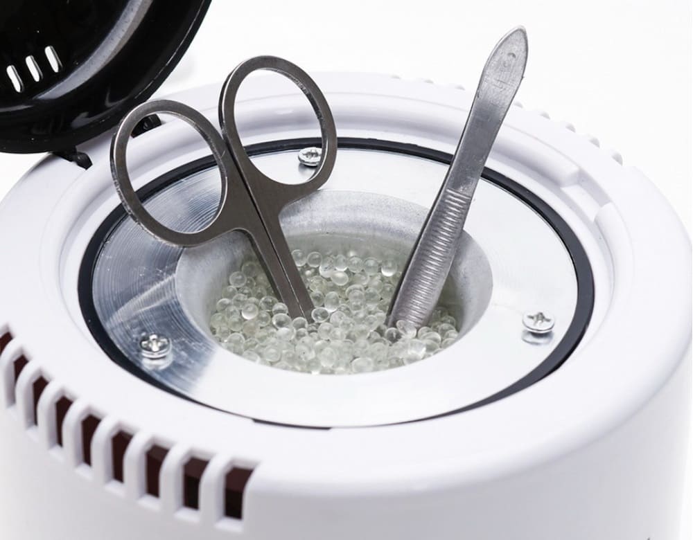 Стерилизатор. Представляет собой вытянутую конусообразную колбу, внутри которой — стеклянные шарики. Прибор полностью термоустойчивый, с его помощью проводят дезинфекцию инструментов, ликвидируя патогенные микроорганизмы и грибки. Шарики нужно менять не чаще 2-3 раз в год в зависимости от частоты применения стерилизатора по назначению.