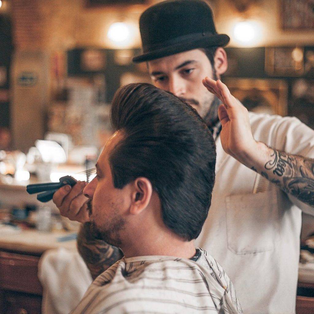 По окончании обработки затылка волосы приподнимаются и зачесываются назад. Как сделать прическу помпадур самостоятельно, мастер подскажет, но лучше стричься. Ведь мастер профессионал и ничего не испортит.