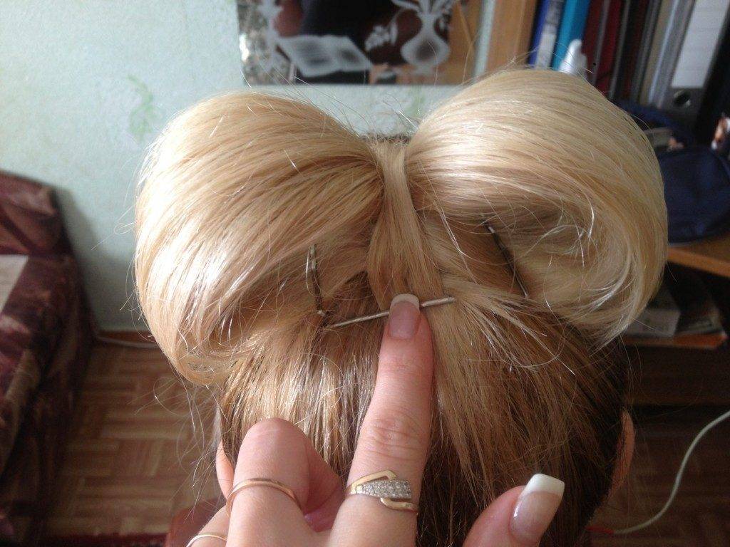 Очень мило выглядят волосы, представленные в виде банта. Для создания такой прически верхний участок волос собирают в хвостик, который улаживают в две равные части и фиксируют с помощью резиночки. Отделите и соберите верхнюю часть волос. Получившуюся петельку делят поровну, фиксируют и выпрямляют. Край волос, оставшийся свободным, направляют к верху, раздвигая при этом волоски в начале резинки и вводят в получившуюся дырочку.