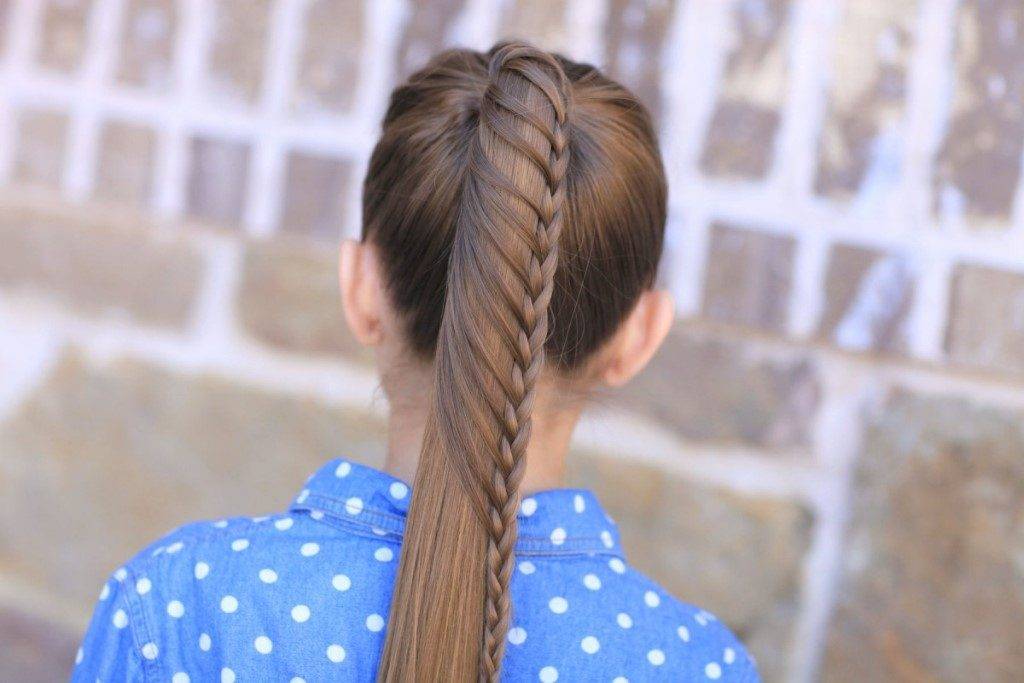Ещё одна разновидность косы «рыбий хвост», которая заплетается из предварительно собранного хвоста. Главным плюсом такой причёски является то,что даже длинные волосы оказываются полностью убранными, а в течение дня, если у активной девочки косичка всё-таки растрепется, можно придать «вторую жизнь» причёске, превратив её в объёмный стильный пучок.