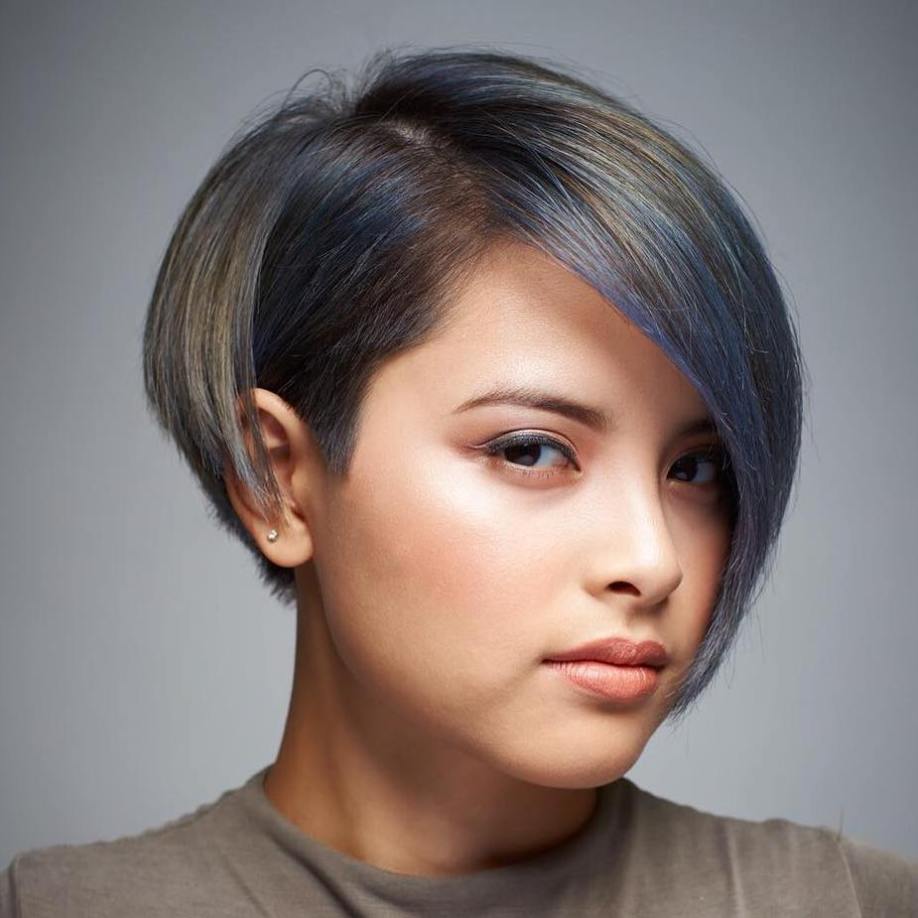 - Удлинить лицо можно с помощью косой челки или же асимметричного пробора.
