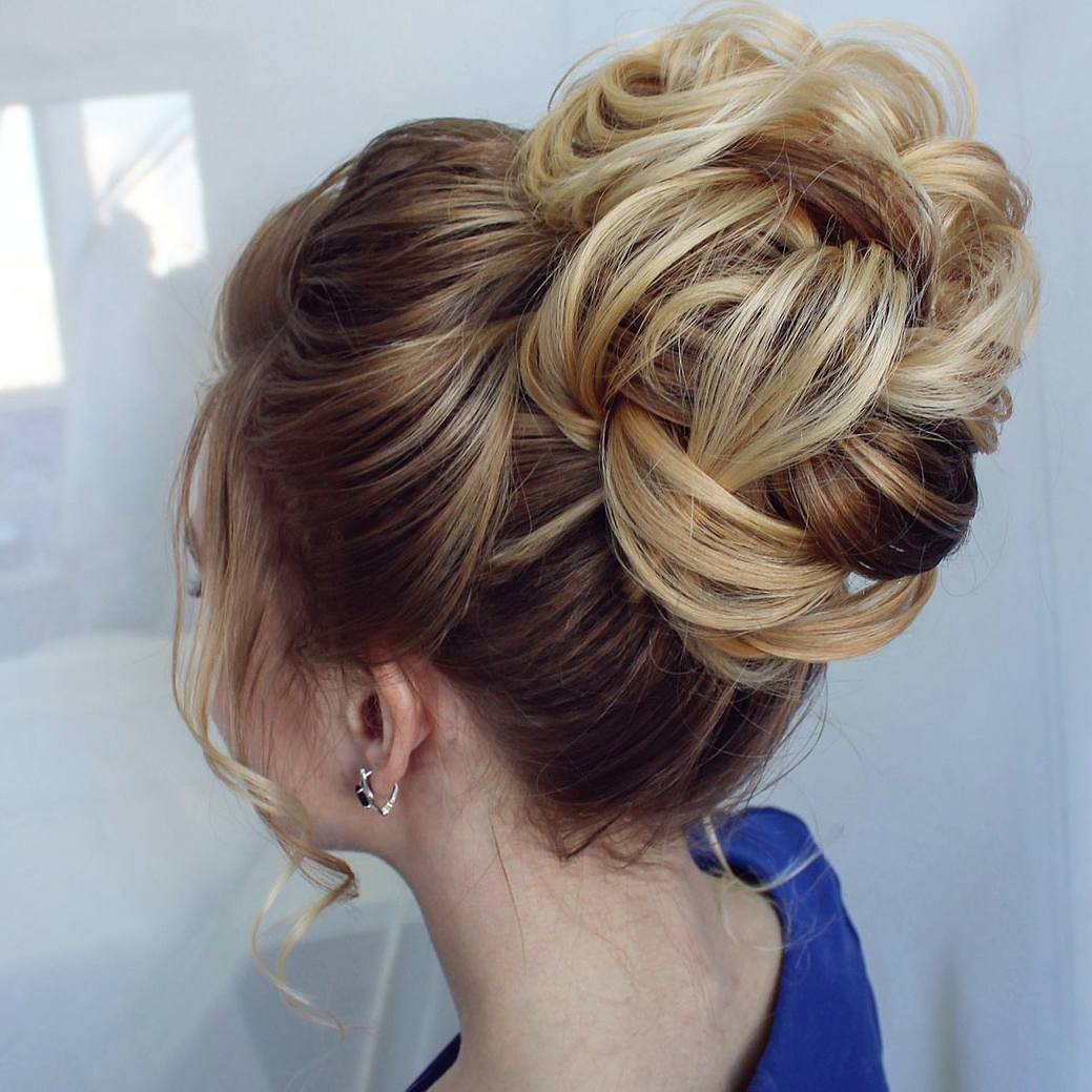 Прическа для торжественных случаев, которая поможет выглядеть визуально выше. Высокие пучки идеально подходят обладательницам волос одинаковой длины, которые не будут выпадать из прически. Тренд последних сезонов – пучки с элементами плетения. Косички, которые аккуратно вплетаются в пучок, великолепно выглядят в деловых образах.