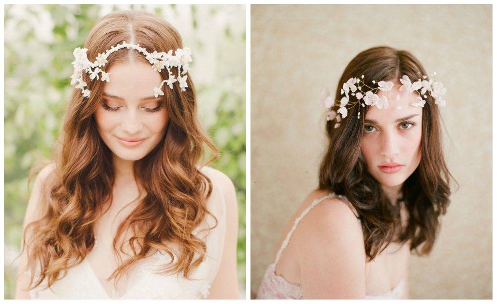 Не менее популярны среди невест прически с ободком из цветов, кстати такое украшение можно запросто изготовить самостоятельно в домашних условиях. Нежные бутоны можно сформировать из полимерной глины, а можно подобрать искусственные цветы и закрепить их на обруче с помощью горячего клея. Изящно выглядят цветы из текстиля: органзы, шифона или шелка.