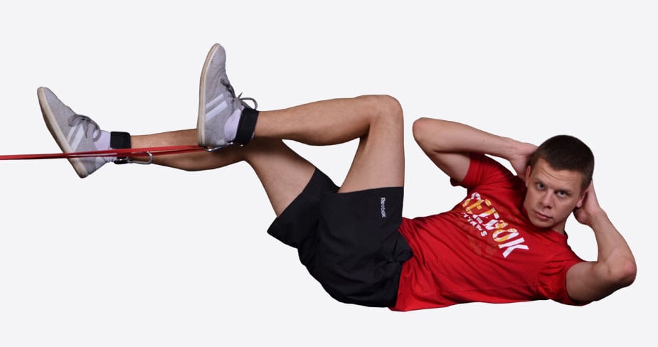 Подтягивания ног. Из предыдущего положения перевернитесь на спину, ноги привязаны к опоре. Подтягивайте колени к животу, удерживая их в этом положении на несколько секунд. Отличная тренировка, в том числе и для пресса.