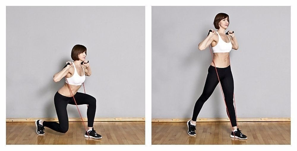 Выпады. Все очень просто: одной ногой наступаем на резинку, другая отставлена назад. Беремся за концы, руки сгибаем к плечам, и так приседаем. Вставая, преодолеваем сопротивление ленты. Приставлять ногу не нужно. Очень простое, но невероятно эффективное упражнение для бедер.