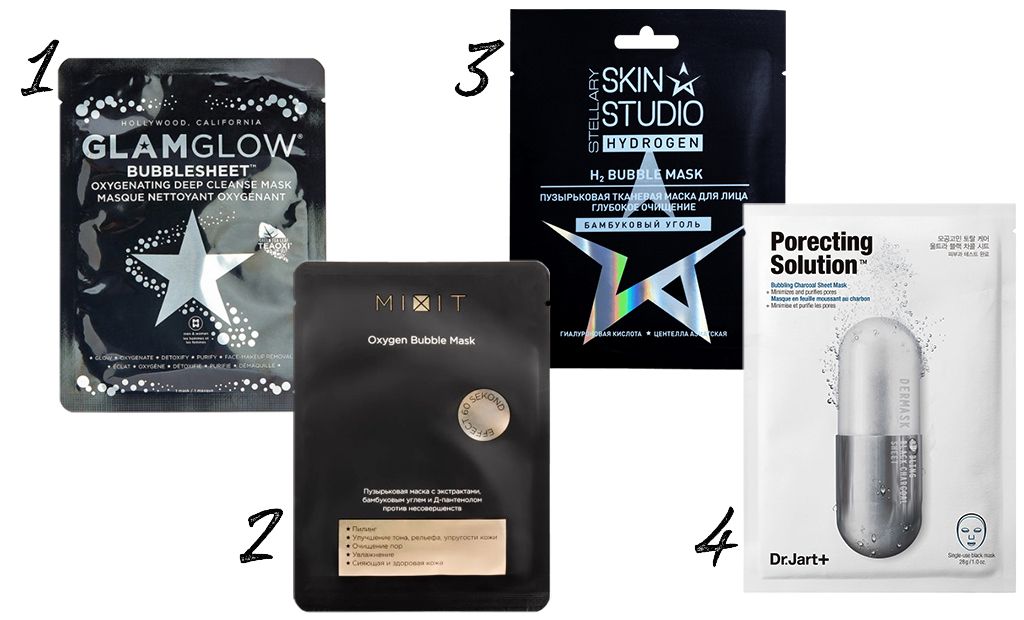 1 – очищающая пузырьковая маска GlamGlow, 2 – пузырьковая тканевая маска против несовершенств Mixit, 3 – пузырьковая тканевая маска для лица “Глубокое очищение кожи” Stellary, 4 – пузырьковая маска “Капсулы красоты” для интенсивного очищения и сужения пор dr.Jart
