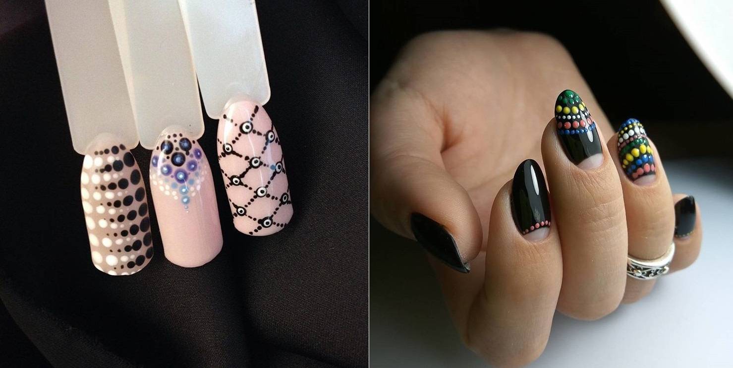 Точки на ногтяхТочки на ногтях. Такие рисунки просты в исполнении. Для этого не потребуется особых умений или навыков. Обязательно нужно проработать будущий дизайн. Правильное сочетание цветов, сделает маникюр аккуратным и привлекательным. Ноготь нужно подготовить. После нанесения и высыхания базового цвета, начинается создание рисунка. Точки могут наноситься на равноудалённом расстоянии, могут накладываться друг на друга. В работе, где используется много цветов, перед нанесением нового, следует обязательно дождаться высыхания предыдущего. Иначе работа может размазаться.
