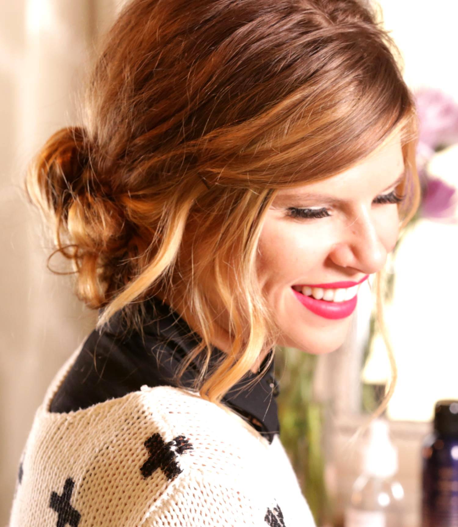 5. С помощью прядей, которые остались с другого конца головы, можно красиво оформить пучок. Нужно оставить несколько локонов свободными, чтобы они небрежно спадали.