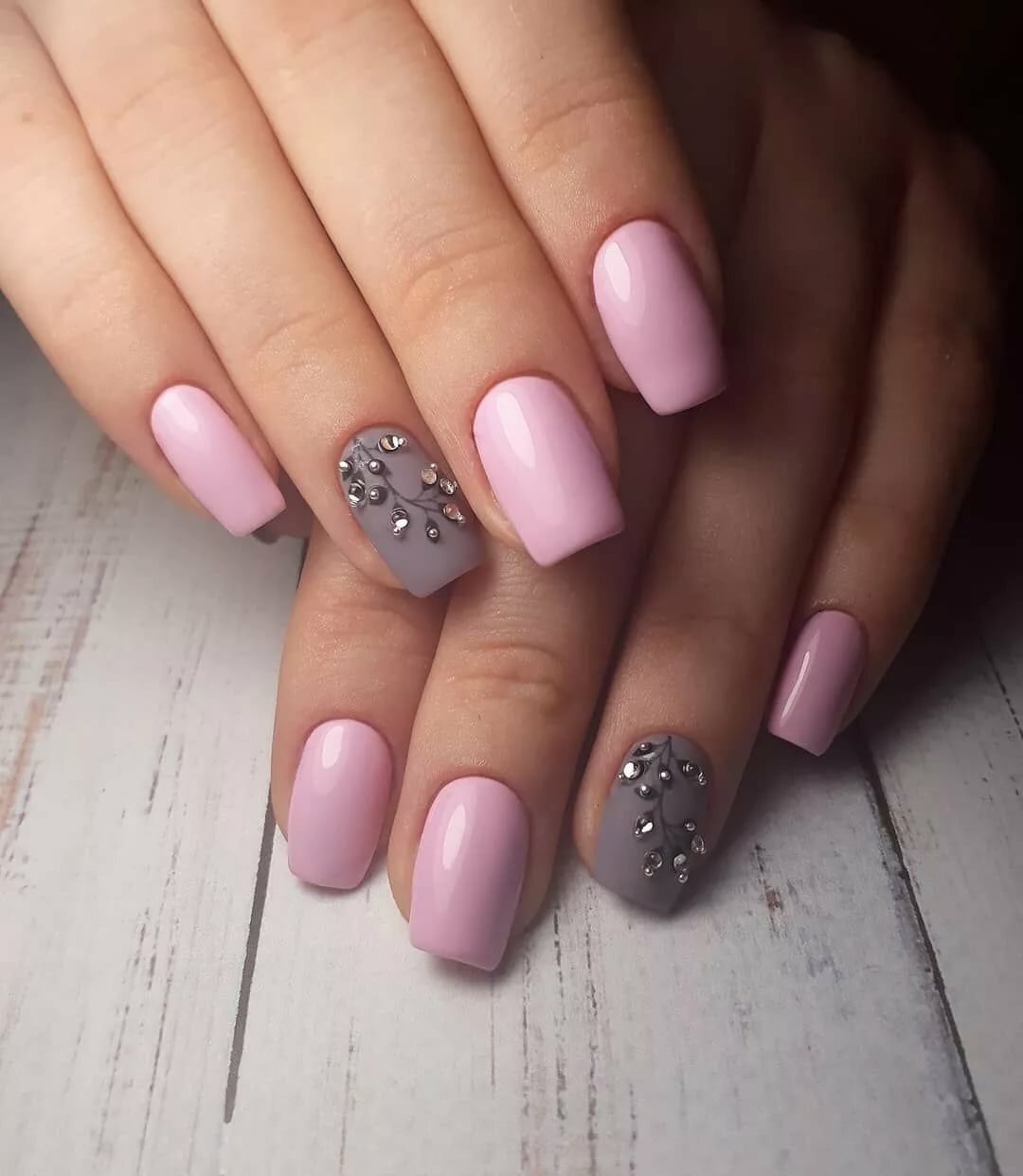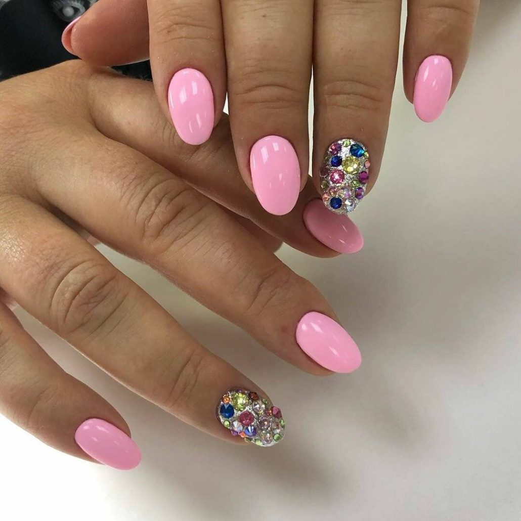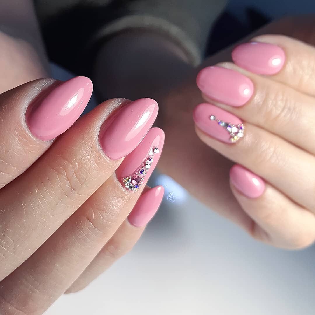 Особый шик и благородство придаст розовому маникюру оформление стразами. Но нагромождение страз смотрится безвкусно. Благородно будет выглядеть маникюр с небольшим количеством оформления украшениями