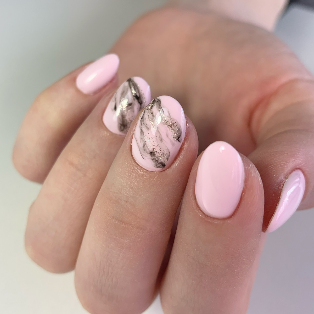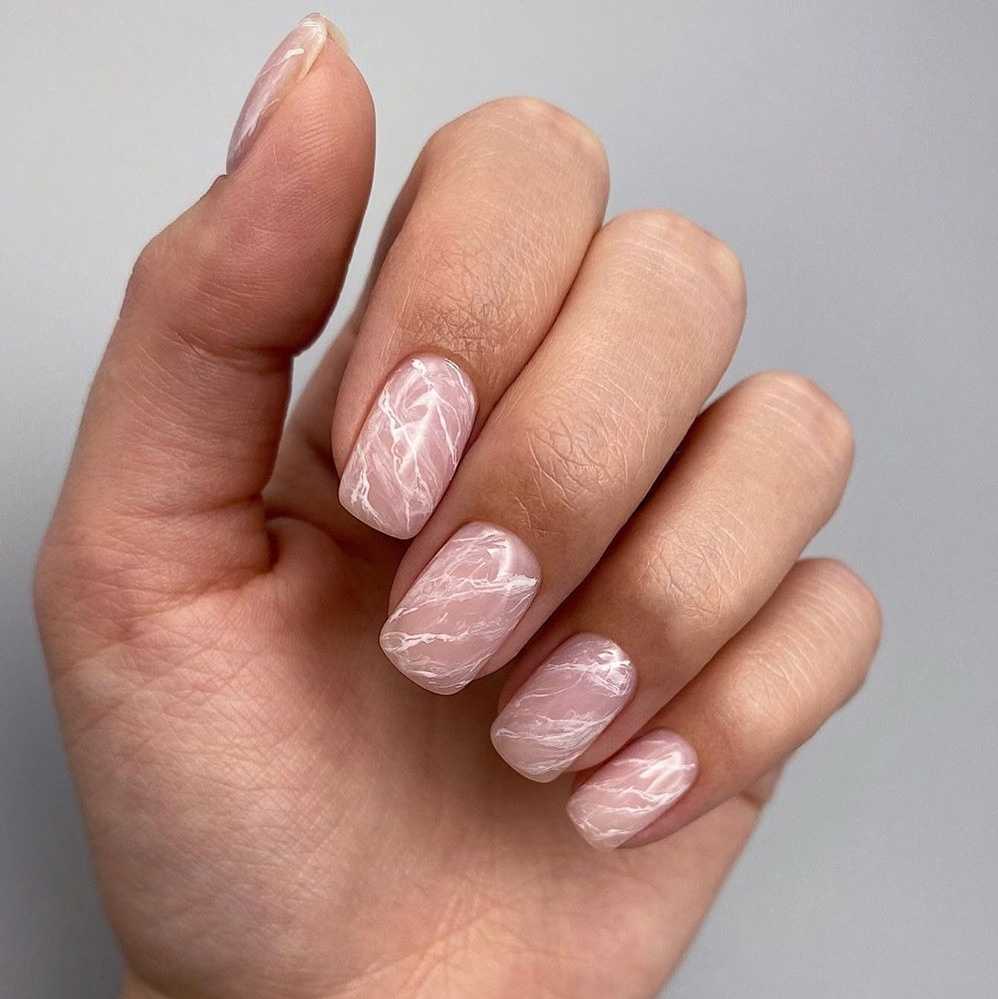 Один из самых элегантных дизайнов, ставших настоящим хитом еще несколько лет назад и до сих пор удерживающих лидерские позиции, является мрамор. Особенно стильно он смотрится на полупрозрачной розовой базе. Так ты убиваешь сразу двух зайцев. Во-первых, мрамор на белой или черной подложке — это довольно банально. Во-вторых, так можно удачно совместить стремление остаться в рамках сдержанного маникюра в нежно-розовых тонах и крутой дизайн.