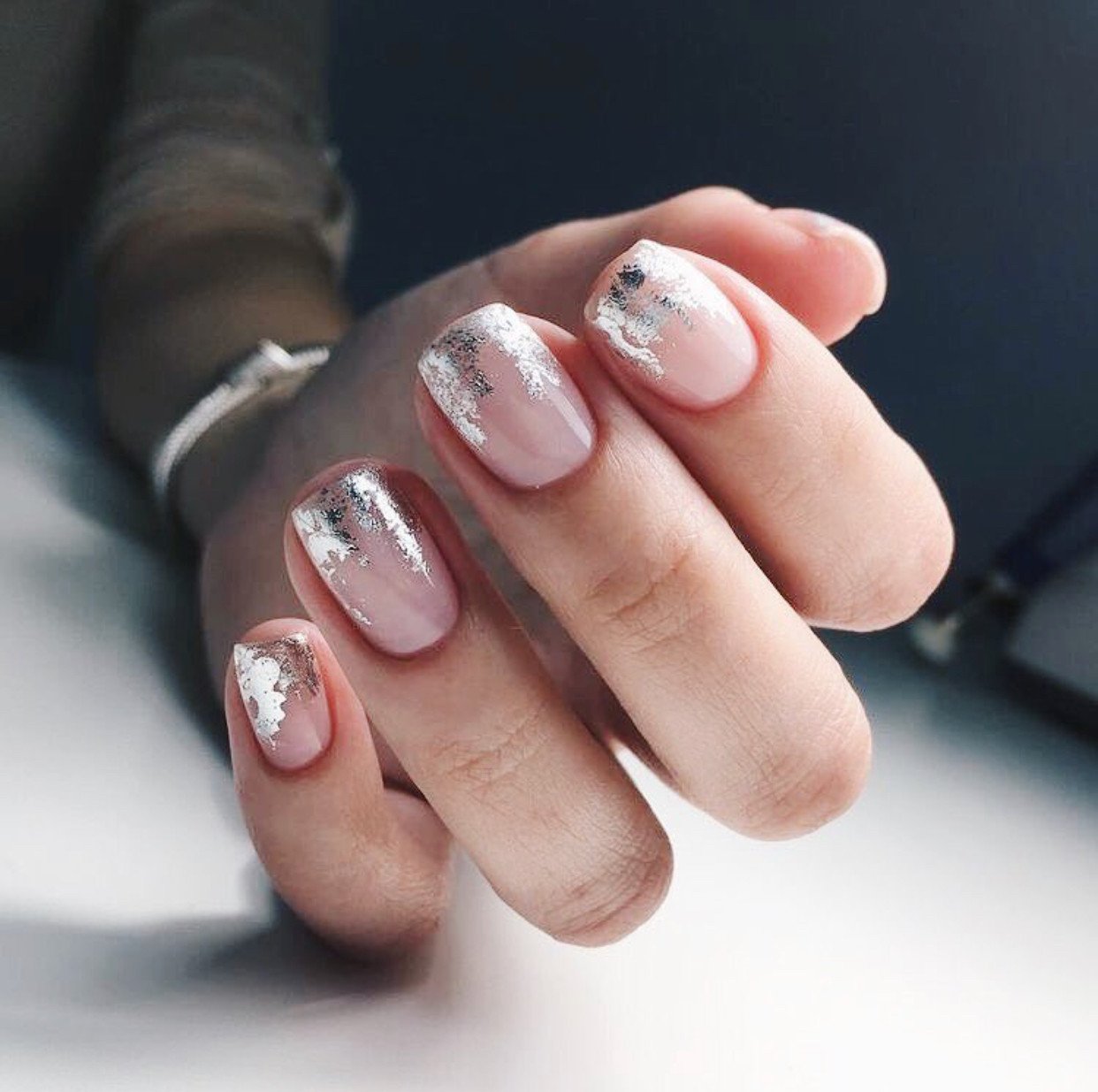 Даже незначительный кусочек блестящей фольги сможет украсить розовый маникюр. Золотистая фольга больше подходит для нюдовых тонов, а разноцветная и серебряная – для более ярких.