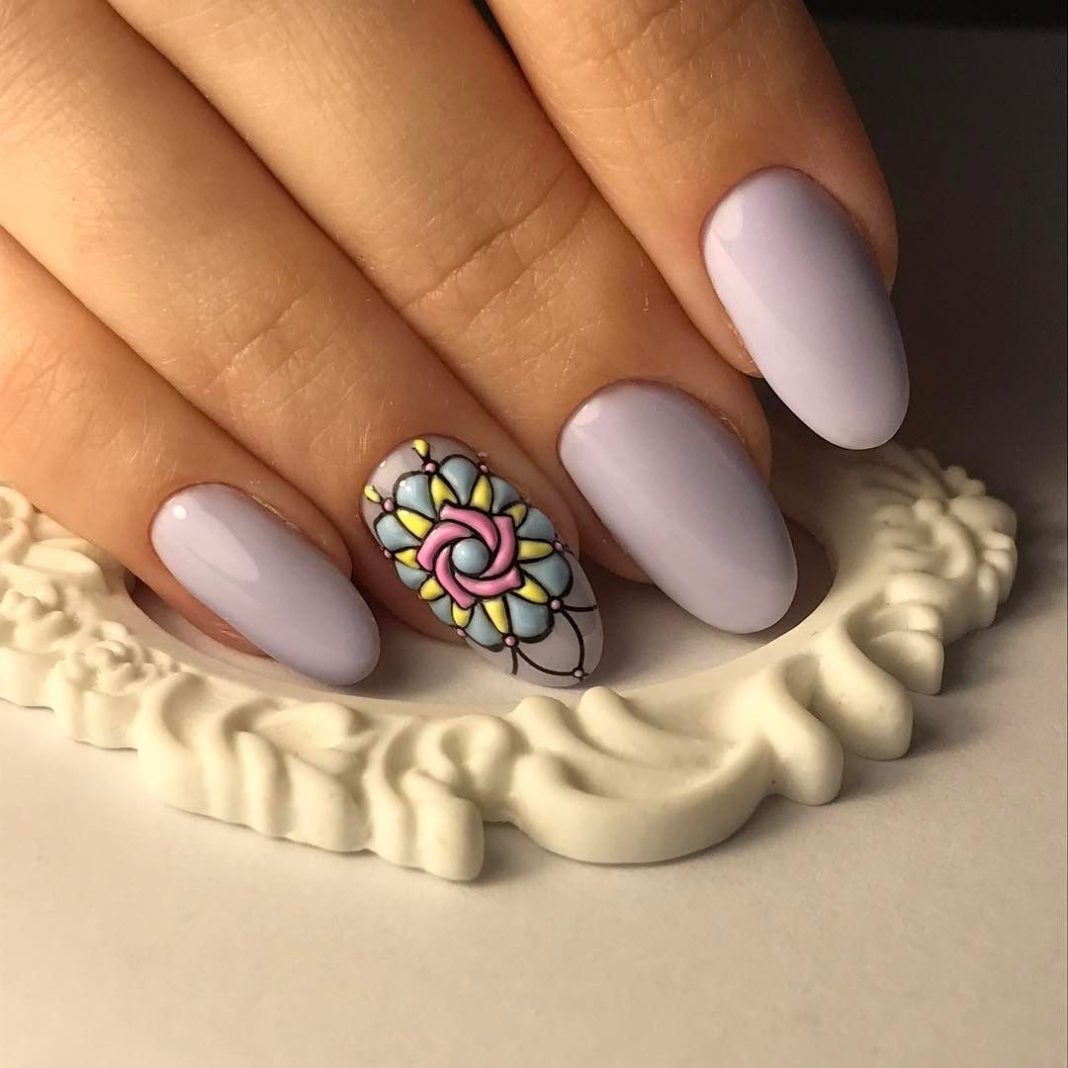 Разнообразить однотонное покрытие можно посредством выделения одного или двух ноготков на средних пальчиках или мизинце. Акцентировать на них контрастом цветовой гаммы или нанести узоры при помощи скотч-ленты, пудры из акрила или произвести роспись кисточкой вручную. Композиции из необычных цветочков, завиточков, кружевной ажурности, а так же графичность рисунков. Изящность ноготку придает вертикальная направленность рисунков.