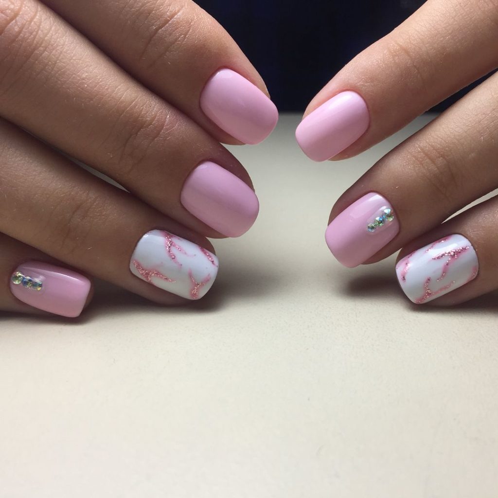 При этом сами мраморные трещинки не обязательно делать белым цветом — к розовому подойдет большинство базовых и ярких цветов. А если захочется сделать маникюр еще более оригинальным, на помощь придут стразы и фольга.