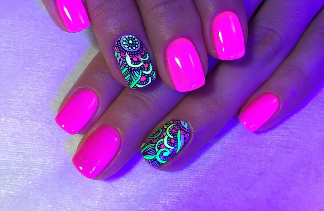 Почувствовать себя королевой диско и выделить маникюр из тысячи поможет неоновый розовый дизайн. Яркий акцент в образе с помощью неонового стильного дизайна, который можно выполнить по-разному: