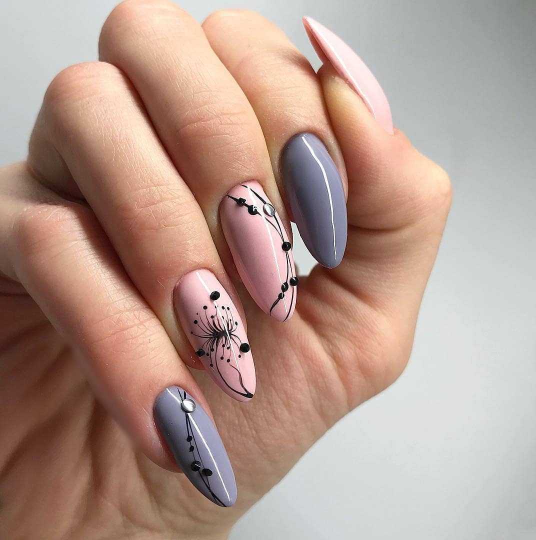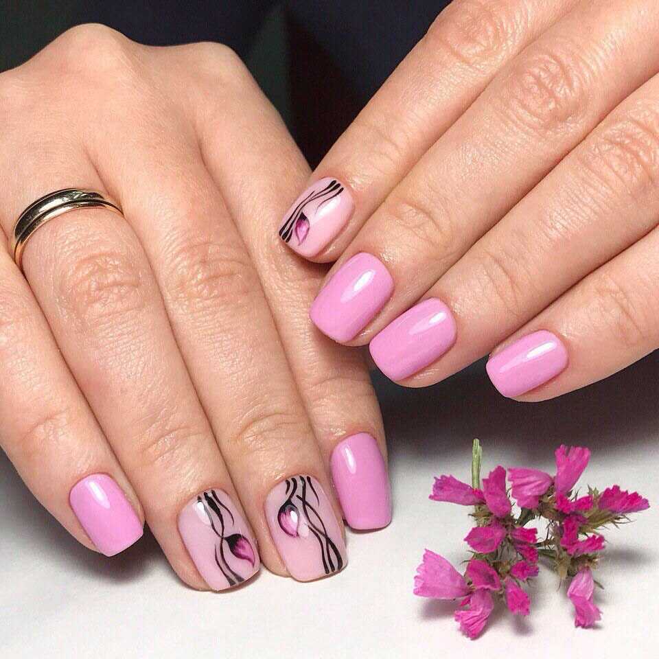 Так как розовый цвет сам по себе достаточно нежный, то он отлично подходит для создания изящного цветочного рисунка на ноготках. Он может быть в минималистичном стиле или наоборот, более крупным, объемным. Чаще всего черный цвет используется в качестве основы. Также иногда мастера добавляют в дизайн еще один нейтральный оттенок, который служит своеобразной подложкой. Дополнительный декор будет к месту, но только в том случае, если он не слишком крупный.