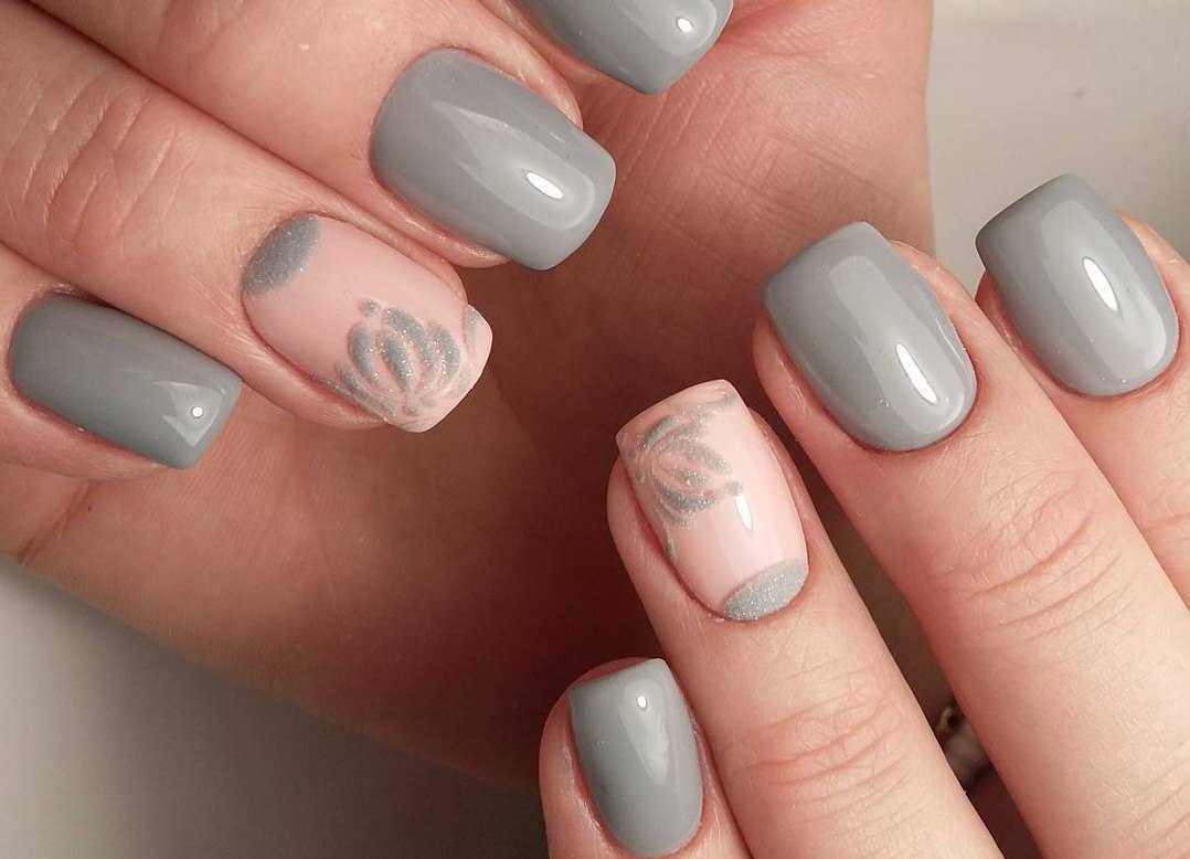 В тренде выделение глиттером одного ноготка на руке, нейл-арты с сухими блестками, френч и лунный маникюр с выделением глиттером прикорневой зоны и края ногтя. Серый цвет по колористике схож с серебряным оттенком, поэтому он будет уместно и красиво выглядеть в тандеме с розовым. Используйте для нейл-артов с серебряным глиттером светло-розовые оттенки: лососевый, розовое кружево, бледно-розовый, пастельный розовый.
