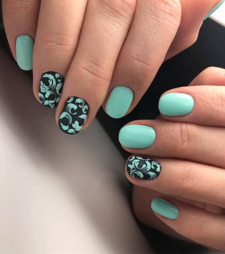 Особенно востребованы розовый, голубой и зелёный цвета. Не следует забывать про орнаменты, что хорошо будут смотреться на французском маникюре, освежая нестареющую классику.