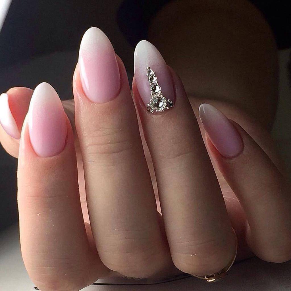 светло-розовых ногтя. Первый ноготь имеет белый базовый лак с тонкими