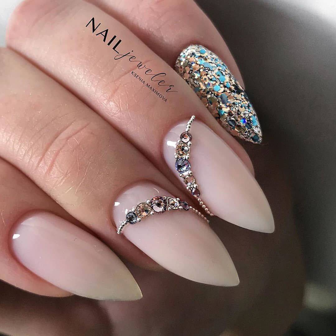 Для создания запоминающейся картины рекомендуется покрыть один ноготь большим количеством сияющих камешков. Но если применить этот способ на всех пальцах, то общее впечатление будет испорчено.