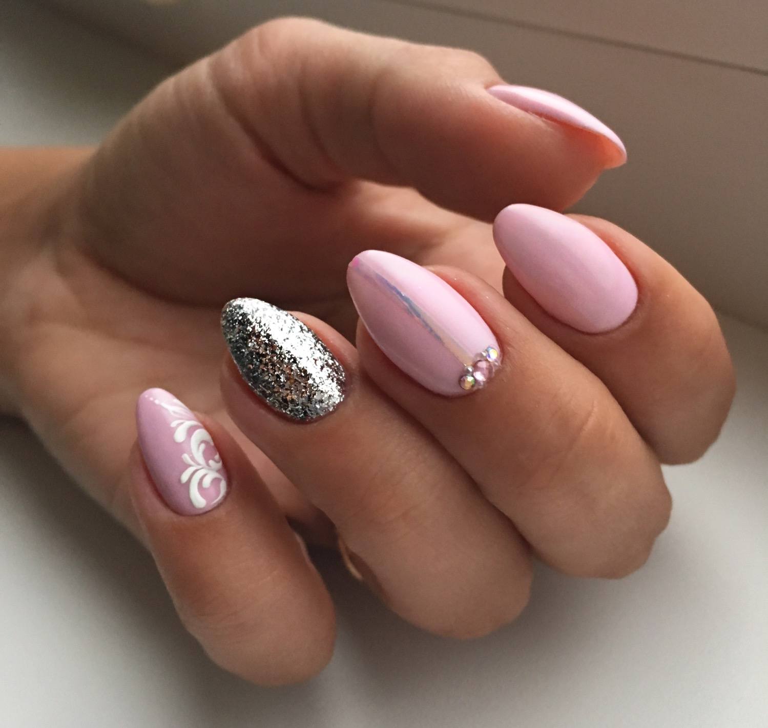 В повседневных образах выручают нейл-арты, в которых один из ноготков украшен сплошным слоем серебряного глиттера, а остальные дополнены стразами в прикорневой зоне. Такой дизайн смотрится уравновешенно и стильно. В торжественном маникюре стразы можно расположить прямо на серебряном или золотом глиттере. Блестки могут присутствовать в композиции из стразов и бульонок. Используйте для декора ногтей серебряные, золотые, радужные, голографические блестки.