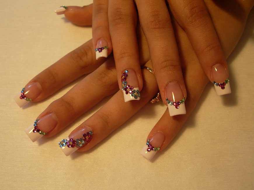 Ногти со стразами можно придать образу френча, разместив по свободному краю ногтя мелкие камешки — это выглядит очень элегантно и изысканно