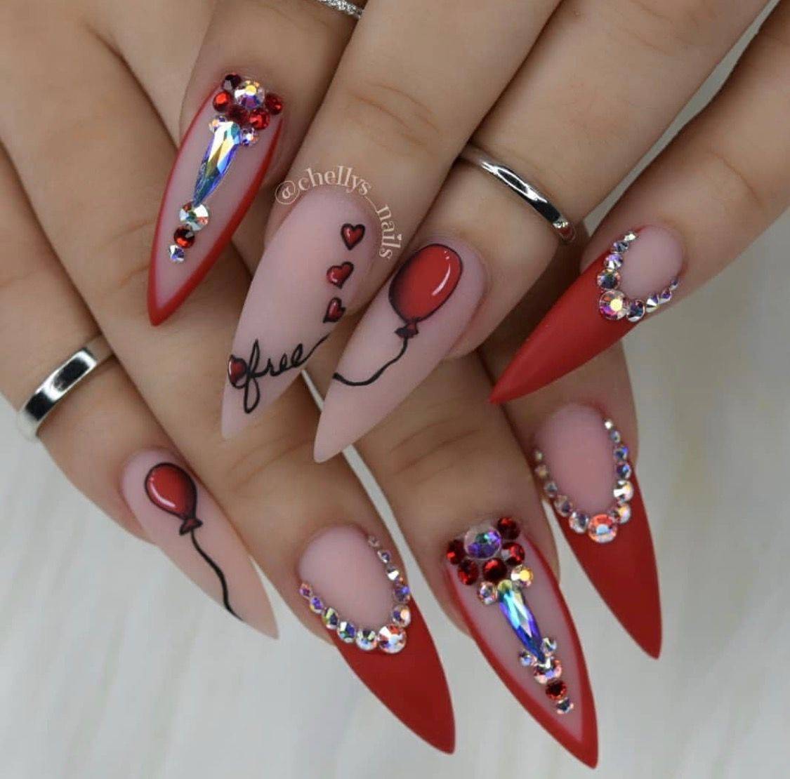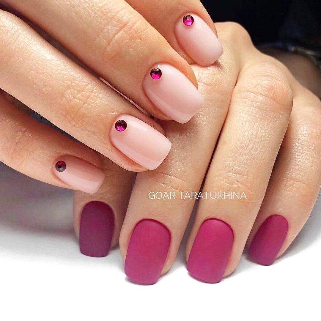 Такое предложение, по мнению нейл-дизайнеров, является беспроигрышным вариантом для создания загадочного и богатого оформления. Бархатное красное покрытие, в любом из оттенков, со стразами, смотрится чрезвычайно элегантно и роскошно. Вам остаётся только покрыть ноготки желаемым тоном и украсить один-два пальчика несложным узором. Разнообразные полосы, аккуратные композиции из украшений разного размера и формы, выделение кристаллами основания либо другой части ногтевой пластины – любой из примеров выглядит волшебно. Также приветствуется сочетание в маникюре глянца и матового топа. Это могут быть как отдельно покрытые разными структурами ноготки, так и модный дуэт на одном ногтевом ложе. Границу между ними можно украсить бусинами или мелкими кристаллами.