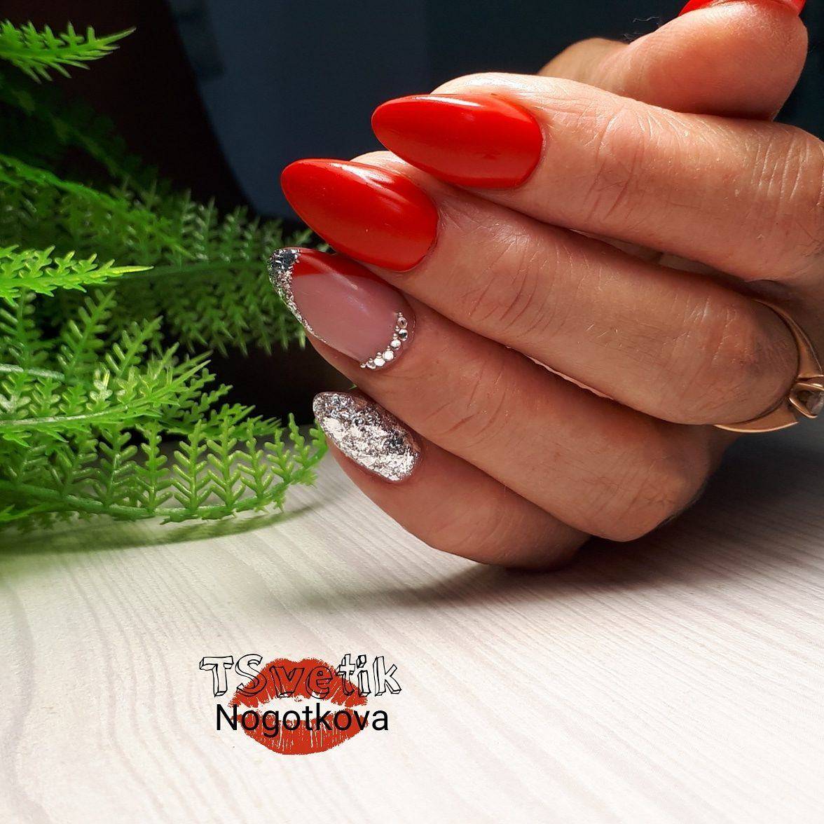 Многие стилисты используют для торжественных или особых случаев всевозможные идеи красного маникюра со стразами и блёстками, ведь если гармонично расположить на ноготках эти дополнения, результат получается просто потрясающий. Украсьте один-два ноготка несложным узором из страз в прикорневой зоне, а на соседних пальчиках создайте глиттерную растяжку. Не менее впечатляет сочетание блеска камней и конфетти. Жидким глиттером можно нанести на красную основу узоры и также дополнить их стразами. Вариаций множество. И да, все эти примеры в конечном результате подтверждают, что блеска много не бывает.