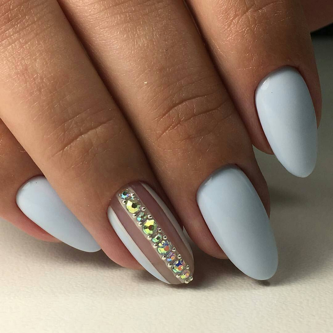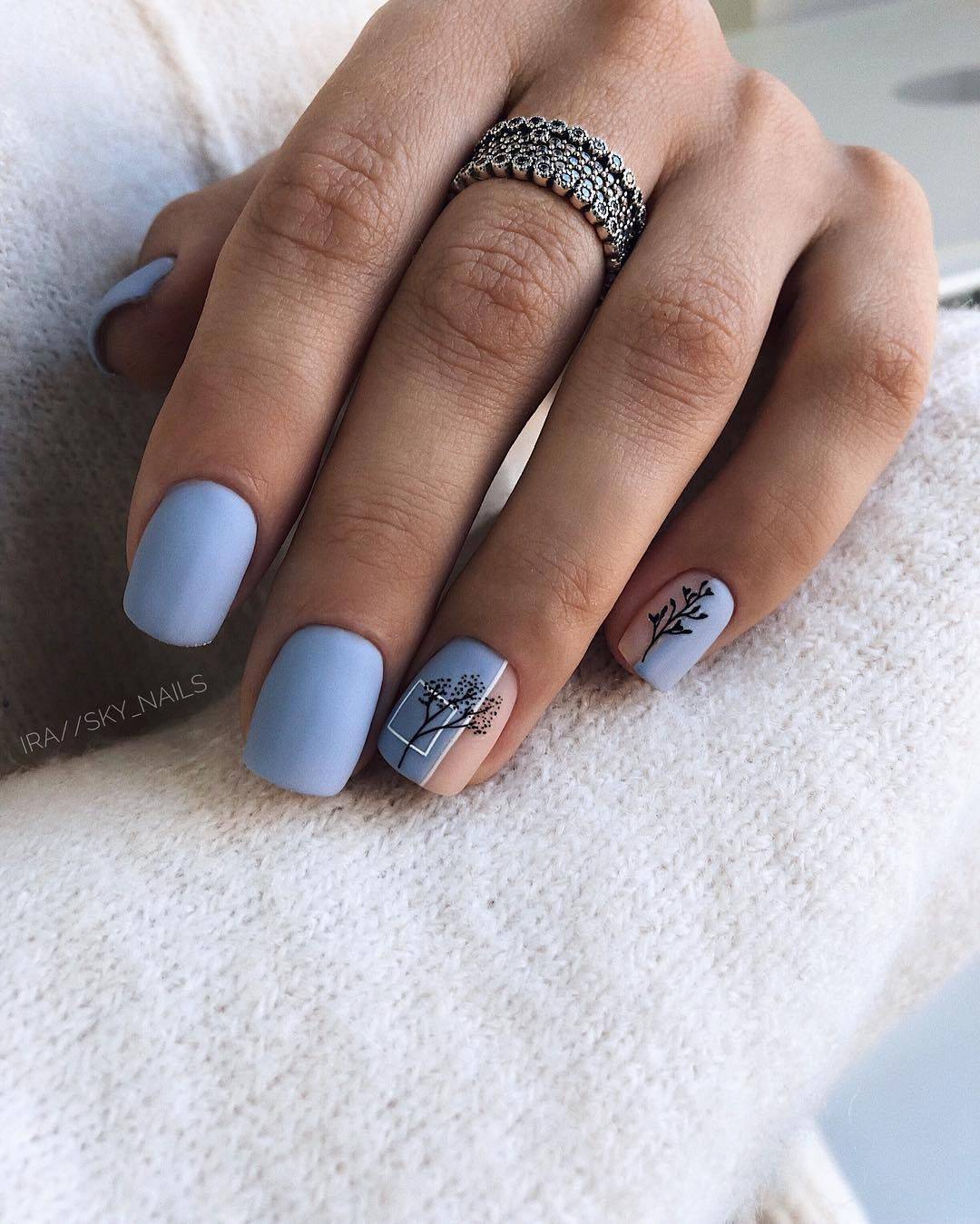 Голубой – еще один оттенок, который будет очень популярен весной 2019. Маникюр на короткие ногти с использованием голубого шеллака весной 2019 года будет смотреться свежо и актуально в монохромном варианте или с легким декором.