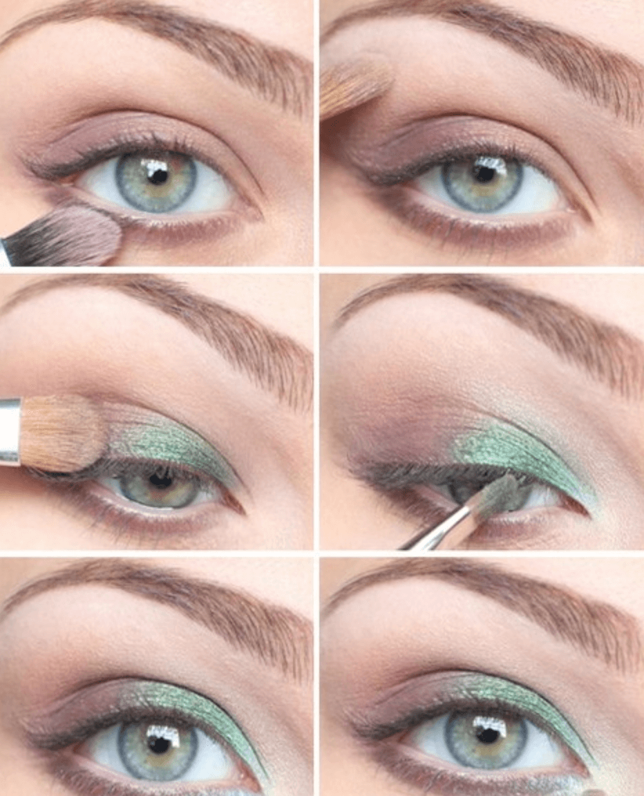 Придать насыщенности свежему зеленому оттенку пепельных глаз помогут холодные бирюзовые, зеленые и теплые шоколадные тени, мягкий карандаш, лайнер или жидкая подводка. Наносим макияж для серо-зеленых глаз (фото) по следующим этапам: