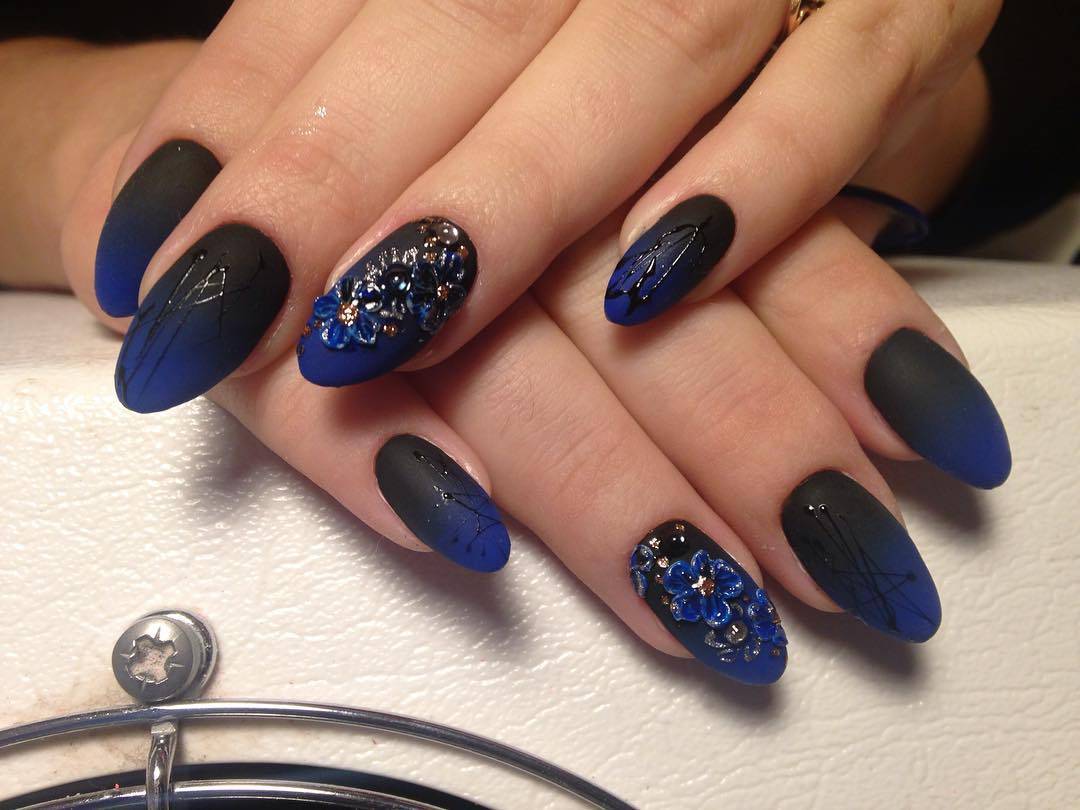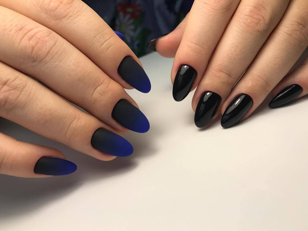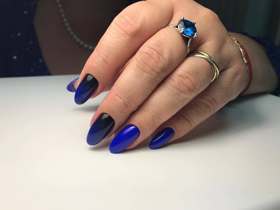 На коротких ногтях отлично смотрится синий маникюр градиент. Можно уйти в сторону затемнения, сочетая яркий синий с черным лаком. Градиент выполняется кистью, губкой, аэрографом, смотря в чем ты достигла наибольшего мастерства. Техника предполагает, что при работе кистью мы тянем светлый цвет на темный, а значит руки клиентки во время работы необходимо будет держать в таком положении, чтобы удобно было двигаться кистью сверху вниз. Для новичков подойдет вариант с губкой, когда необходимо нанести на неё три полоски, где средняя – это уже готовая смесь двух сочетающихся тонов. Далее необходимо аккуратно нанести несколько слоев и закрепить топом.