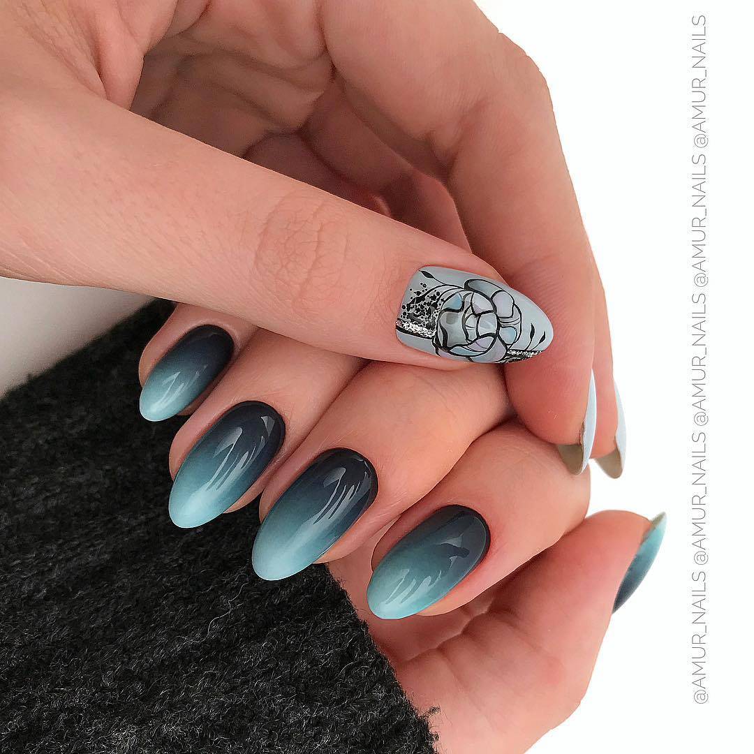 Такие сочетания могут быть в разных оттенках, но в любом случае серо-синий маникюр в тренде. Светлый серый цвет хорошо сочетается с темными холодными тонами синего, темный серый — наоборот, со светлыми тонами синего. Идеально дополнить его серебристым декором в виде глиттера, страз и пр.