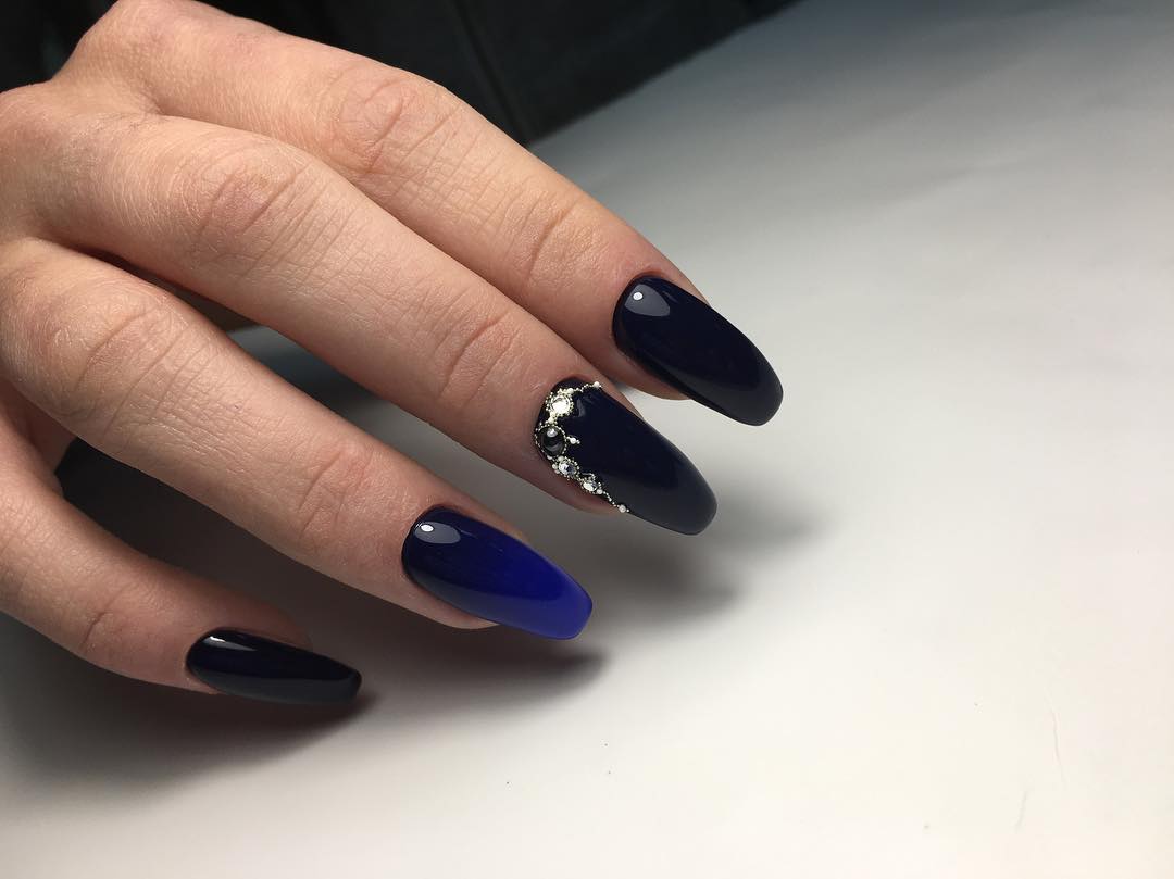 Темно-синий маникюр с легкими бликами блесток придает всему образу четкости, выразительности завершенности. Такой оттенок подойдет к любому наряду, так как может стать альтернативой черному. Декор из стразов создаст праздничное настроение. Можно сделать его минимальным, украсив камнями только один ноготь, или декорировать два средних пальца, сделав маникюр по фен-шуй.
