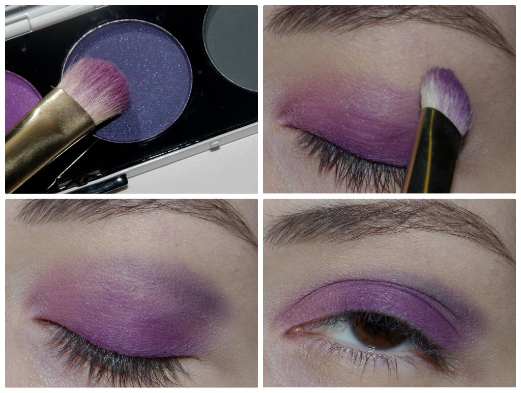 Подготовленное лицо перед нанесением декоративной косметики обязательно надо припудрить, так макияж продержится дольше и у него будет меньше шансов скататься или потечь. На верхнее веко от подбровного пространства до складки накладывают бледно-сиреневые тени и этим же цветом подводят нижнее веко под ресницами. Более тёмным тоном теней подводят подвижную область века, а линию роста нижних ресниц прорисовывают фиолетовым или чёрным карандашом.