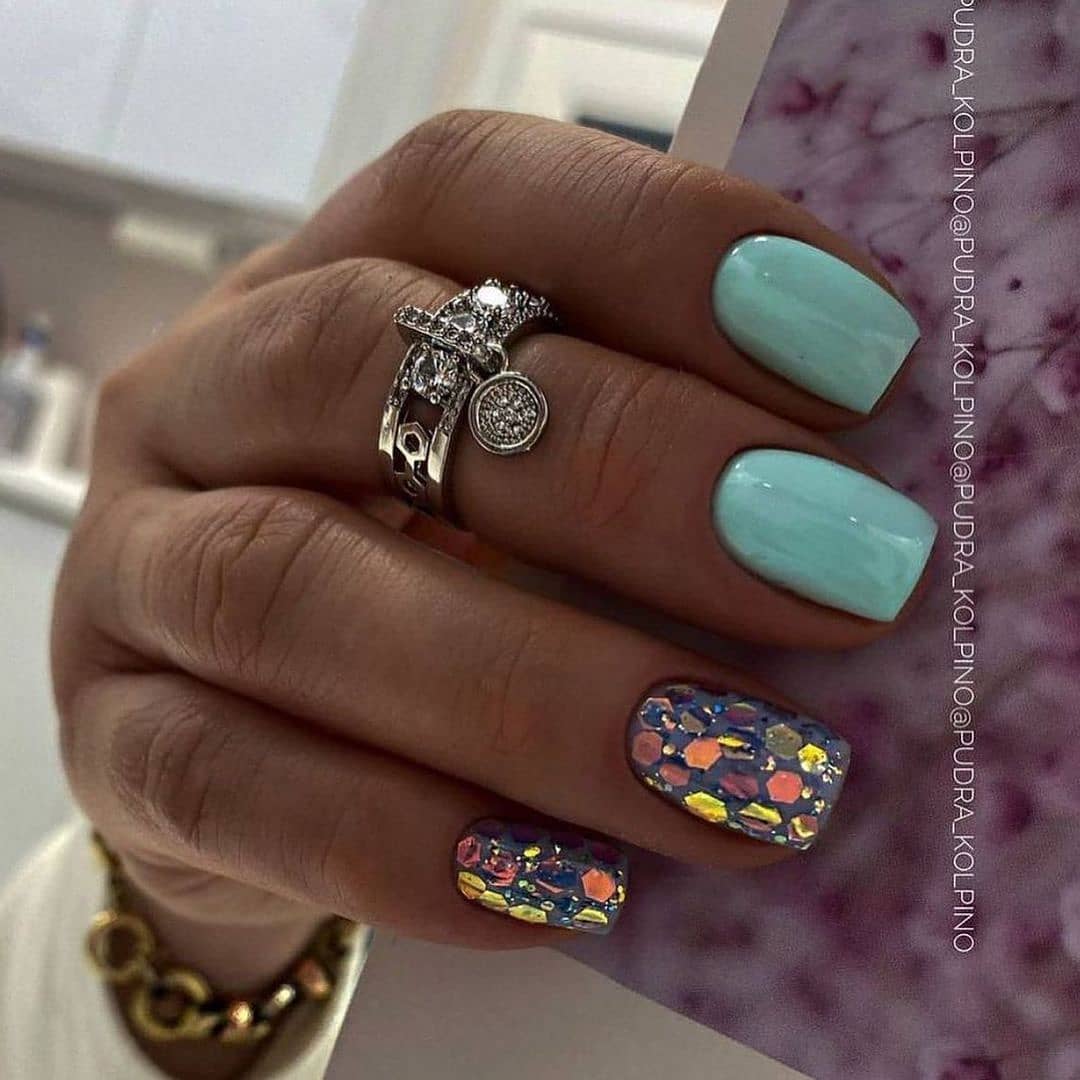 3. Затем опят нанесите базу на ноготь с блестками и отправьте в лампу на 10 секунд. Опять нанесите блестки на безымянный, а также второй слой лака тех же цветов на три других ранее покрашенных пальца. Просушите. Потом нанесите по третьему слою лака (блестки третьим не надо). Просушите.