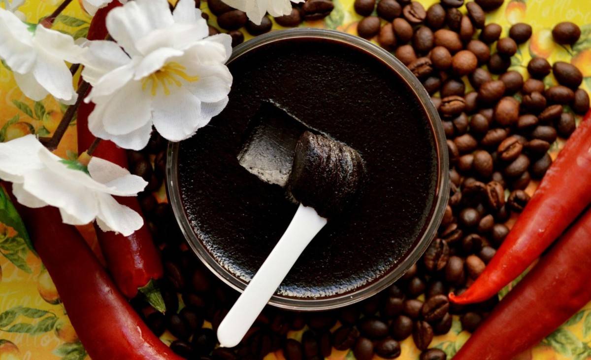Кофе ( не важно какие зерна арабика или робуста) разводят в горячей воде до кашеобразной консистенции, затем добавляют туда оливковое масло и перец. Перед нанесением на кожу, скраб проверяют на жгучесть распределяя на запястье