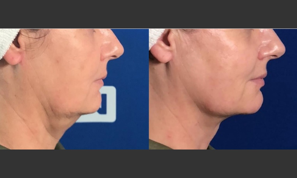 Например, с филлером Радиесс (Radisse) – препаратом на основе гидроксиапатита кальция, активирующим синтез коллагена и эластина и влияющим на увеличение толщины кожи. Существует протокол, когда сначала вводится филлер, а затем проводится аппаратная процедура. Получается двойной эффект: Ulthera укрепляет мышечно-апоневротический слой SMAS, обеспечивает подтяжку, уплотняет кожу, а Radiesse, в свою очередь, стимулирует неоколлагенез. То есть, получается, что одна процедура усиливает действие другой. В результате идет мощная подтяжка тканей с одновременным улучшением качества кожи.