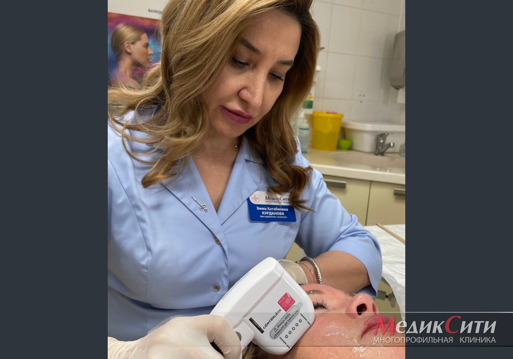 На фото процедуру SMAS-лифтинга в МедикСити выполняет врач-косметолог МедикСити Эмма Хатабиевна Курданова