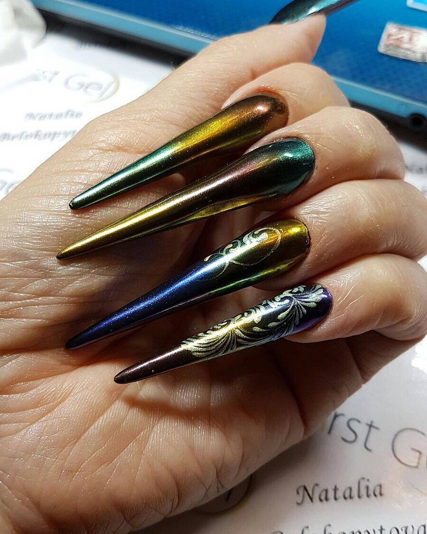 Ни для кого не секрет, что стилет является самой удачной формой для экспериментов. Именно на большом пространстве ногтя мастера нейл-арта могут выражать себя в аквариумной технике. Ноготки, как слоеный пирог, наполняются всевозможными украшениями: бульонки, стразы, фольга для литья, блестки, сухоцветы, хлопья юки и многое другое. На конкурсах можно увидеть огромное количество необычных и уникальных дизайнов, которые приносят вдохновение.