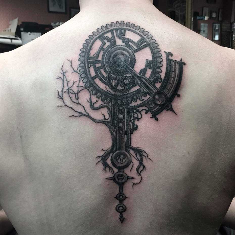 Идей татуировок в этом стиле существует масса: от наколок паровых машин, до кораблей на паровом ходу, а также паровозов и паровых экипажей. персонажи в противогазе. Главное, чтобы изображение включало в себя большое количество шестеренок, оружие, а также других механических элементов.