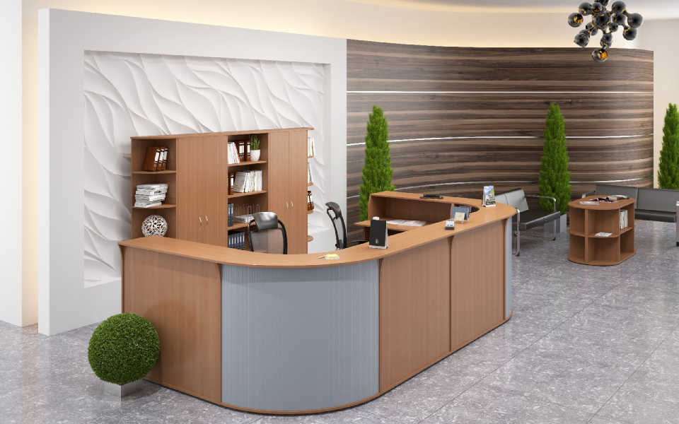 - Сбоку от входа – таким образом офисные работники (особенно если стойка длинная и предполагает одновременную работу нескольких секретарей) не мешают посетителям проходить в другие помещения, но могут наблюдать за клиентами и быстро оказывают помощь при обращениях;