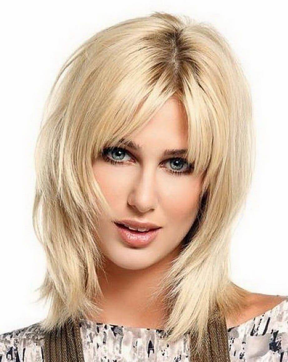 Стрижка дебют на средние волосы с чёлкой и без неё смотрится просто восхитительно. Итоговая длина прядей в данном случае может варьироваться от подбородка до ключицы, если смотреть спереди, и лопаток, если сзади. В любом случае образ получится очень нежным, мягким и гармоничным. Хотя некоторые способы укладки, например, эффекты творческого беспорядка, имитация рваных кончиков и другие, помогут сменить вид романтической особы на дерзкий и креативный образ.