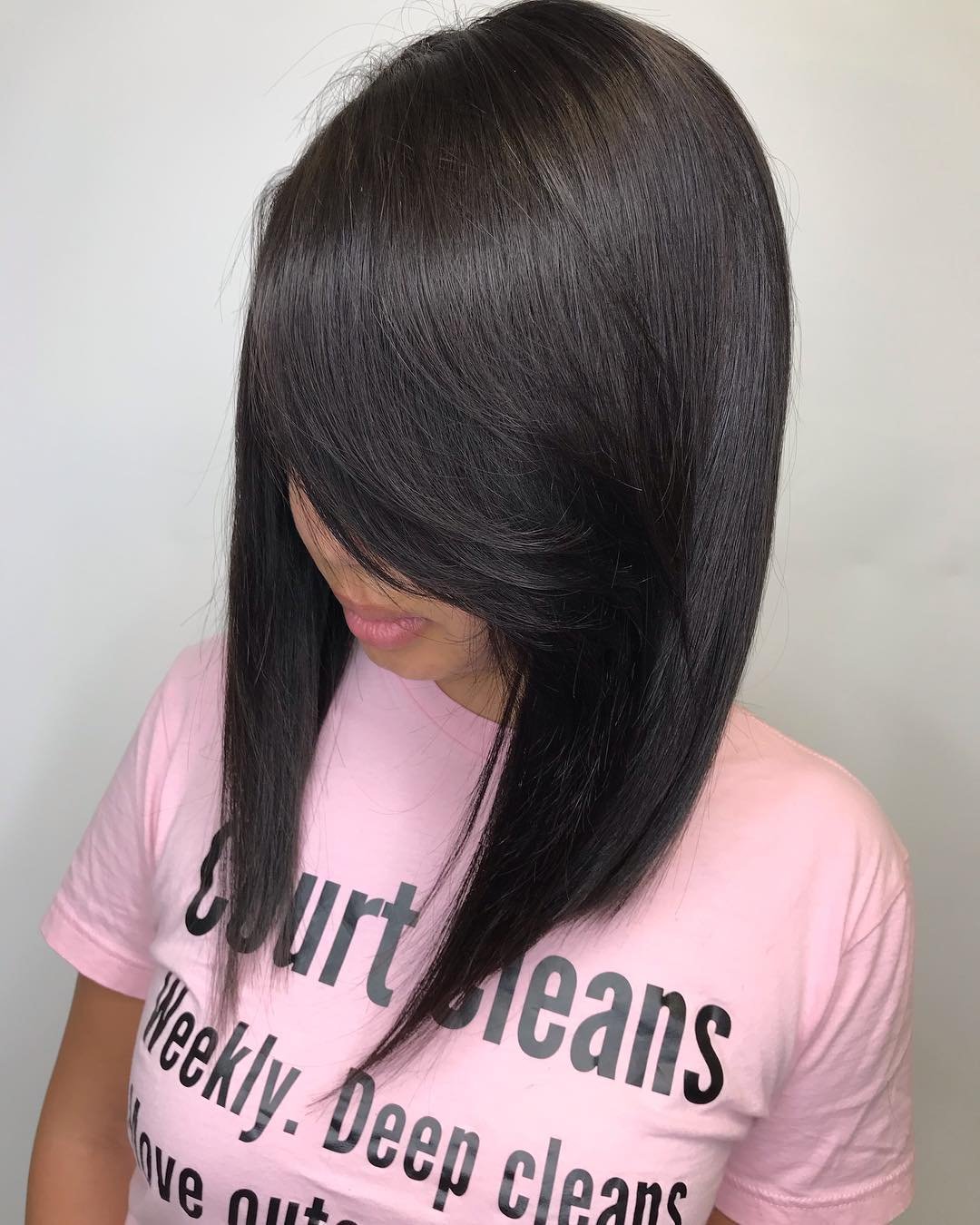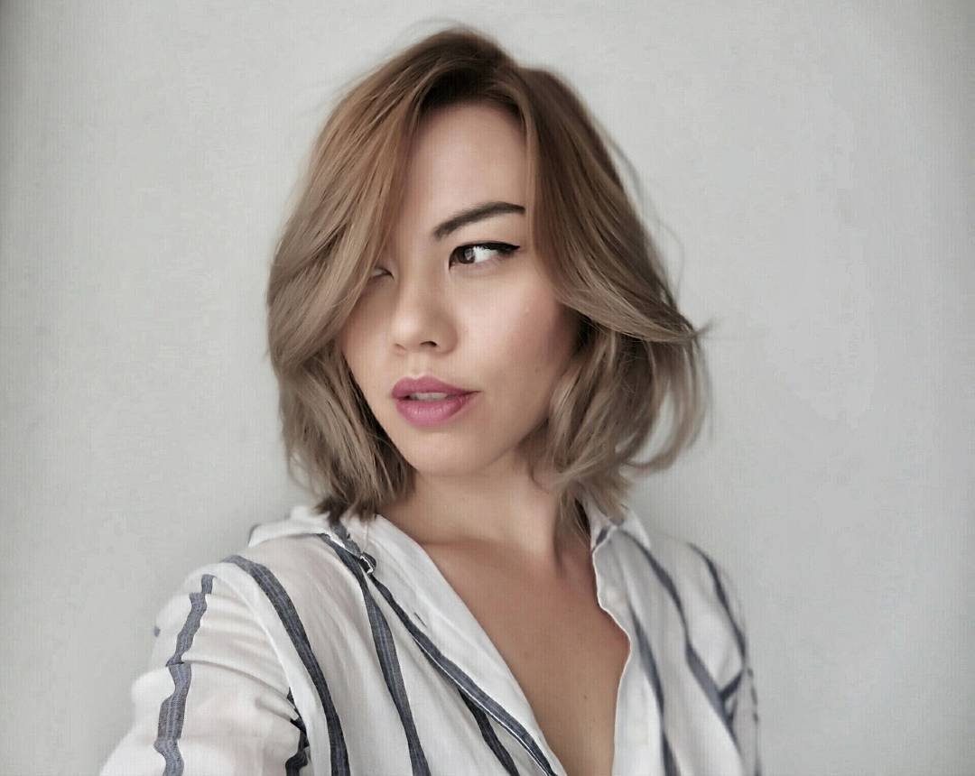 Косая челка сама по себе очень популярная сейчас модная тенденция, позволяющая делать образ незаурядным. А вкупе со средним каскадом она будет смотреться еще более привлекательно и стильно. Тем более, если углубиться в технику, то получается, что косая челка словно вливается в прическу, удачно комбинируя ее с переходами и слоями.