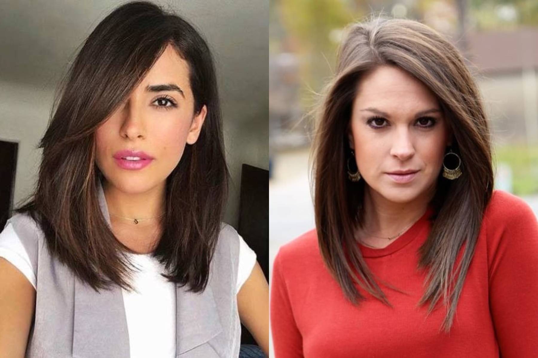 Выбирайте удлиненные варианты, ниже уровня плеч, с градуировкой на концах, с боковым пробором. Избегайте гладких причесок, которые заканчиваются до линии челюсти, пышных локонов.