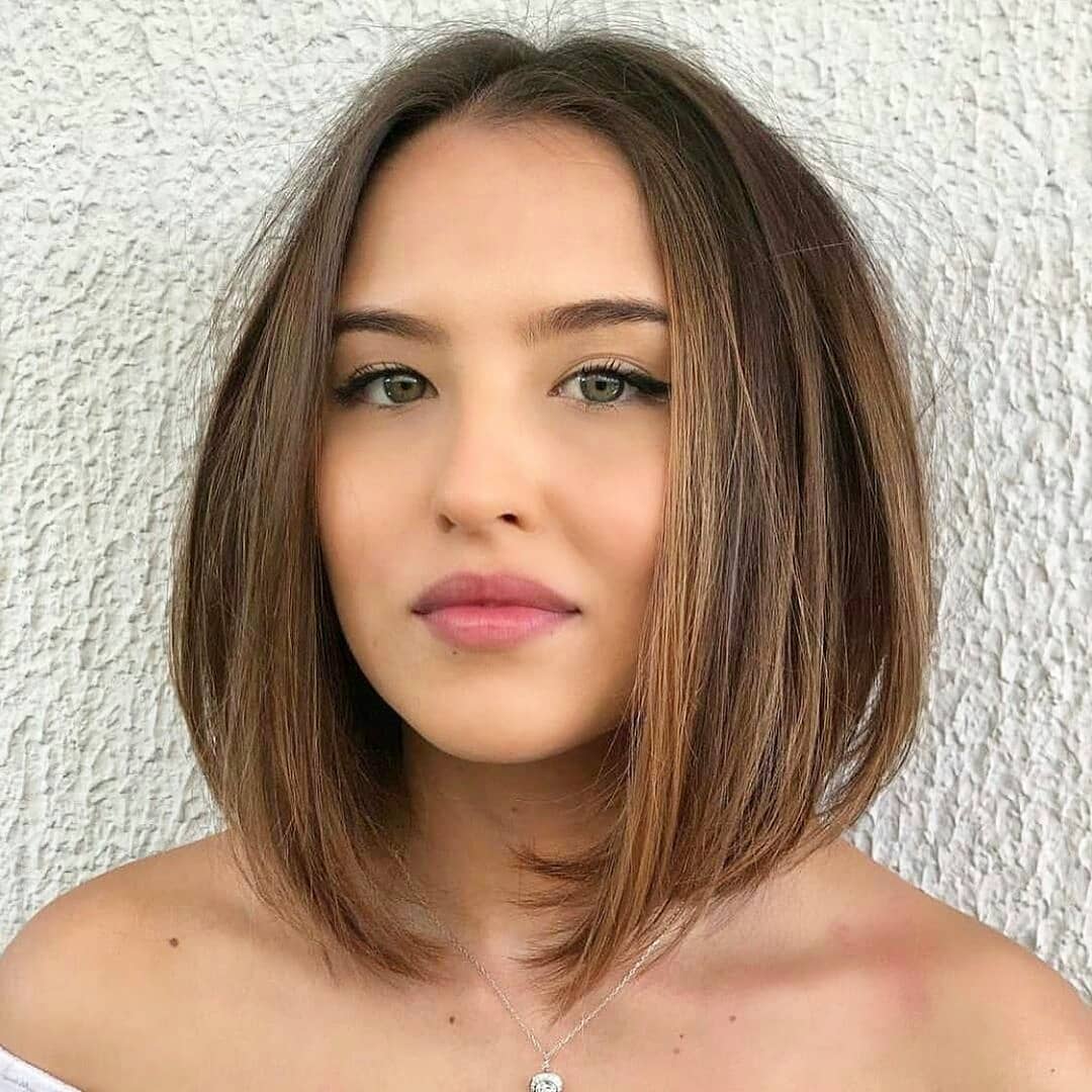 - Овал лица. Для круглой формы лучше выбирать классические стрижки. Это может быть каре длиной ниже подбородка с боковым пробором. Блант-боб идеально подойдет к лицу квадратной формы. Передние пряди помогут скрыть широкие скулы. Каскад с челкой рекомендован обладательницам треугольного лица. Пряди длиной до плеч сделают акцент на зону подбородка. Для этого необходимо придать объем кончикам локонов. Подойдет любой способ укладки. Например, формирование локонов с применением щипцов, придание пышности с помощью специальных косметических средств.