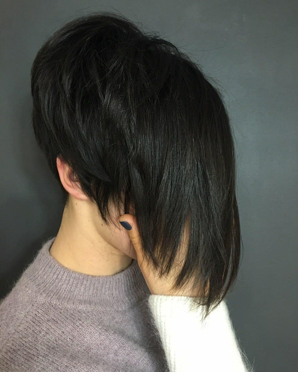 Эта модель смотрится на миниатюрных стройных женщинах. Она создает по-юношески задорный образ с нотками загадочности. Отличается большим объемом на затылке. Это достигается градуированием прядей. Волосы на висках плотно прилегают к голове. Стрижка значительно омолаживает. Стилисты советуют женщинам за 40 использовать ее в создании образа.