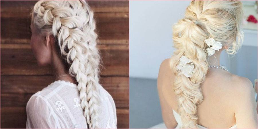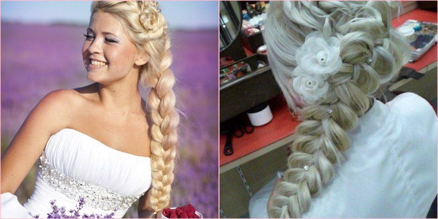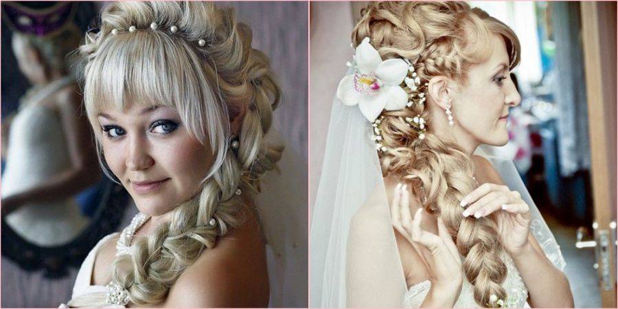Небрежно собранные объёмные косы с выбившимися прядями – отличный вариант для нежной и хрупкой девушки. Заплести в виде венка или вывести плетение сбоку от лица – вариант зависит от предпочтений невесты.