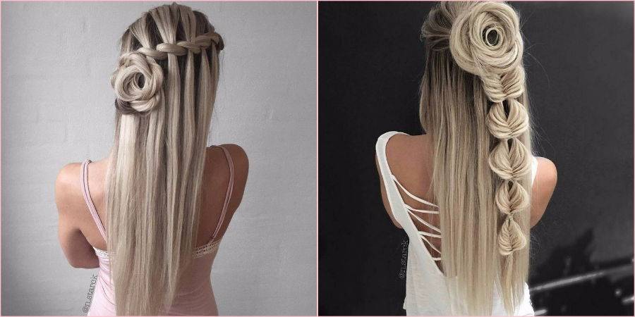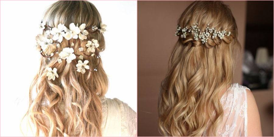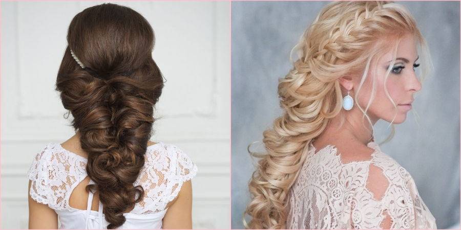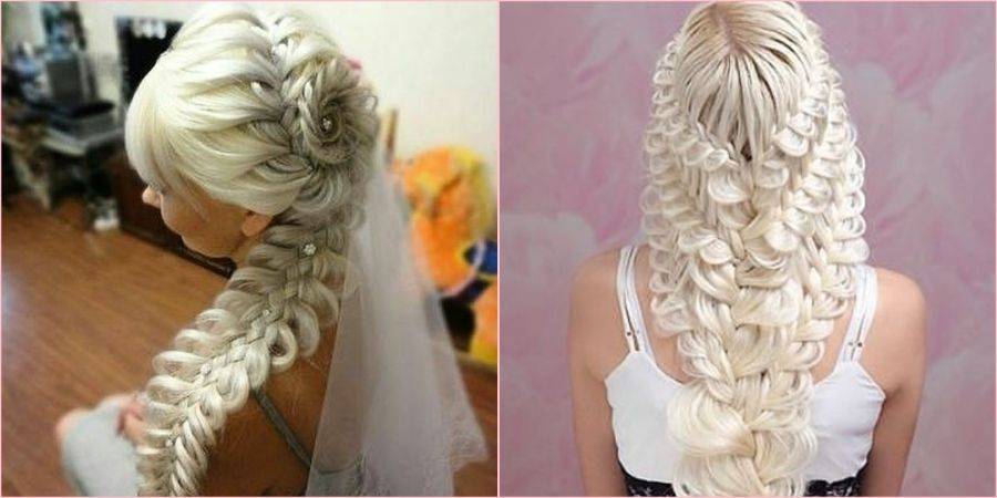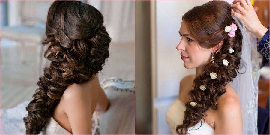 Отличный женственный, романтичный и красивый вариант, к которому подойдут украшения в виде цветов, разноцветных атласных лент, жемчуга, заколок, а вот фату лучше не надевать, чтобы не закрыть сам «Водопад». Эффектнее всего такая укладка смотрится на мелированных и светлых волосах.